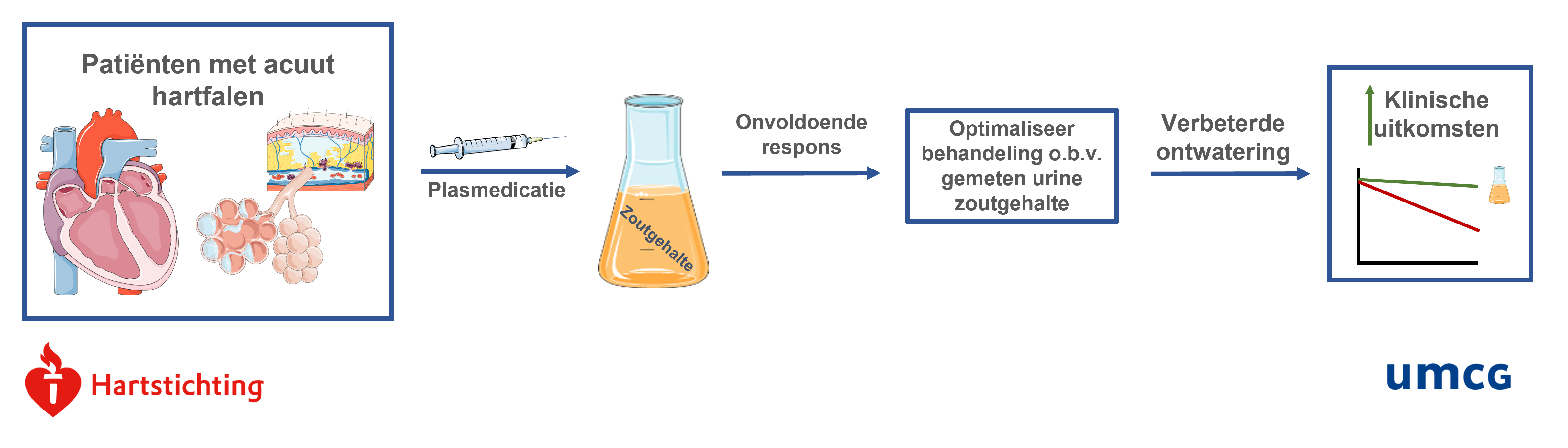 Wij hebben recent aangetoond dat de hoeveelheid zout in de urine gebruikt kan worden om het effect van de lisdiuretica (plasmedicatie/pillen) op het vocht bij patiënten met hartfalen vast te stellen. Er is zelfs bewijs dat de hoeveelheid zout in de urine twee uur na het toedienen van de eerste gift lisdiuretica (plasmedicatie/pillen) een indruk geeft van het effect op de vochtuitscheiding in de daaropvolgende uren. Het doel van deze studie is om te onderzoek of we het zout in de urine kunnen gebruiken om tijdig patiënten te identificeren die onvoldoende vocht kwijtraken op de bij opname gestarte behandeling én of we de zoutuitscheiding kunnen verbeteren door aan de hand van het zout in de urine de behandeling aan te passen.
